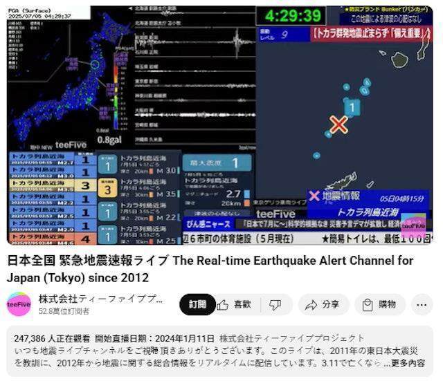 日本全国紧急地震速报的Youtube直播在2025年7月5日当天凌晨4时左右有接近25万人观看(网页截图)